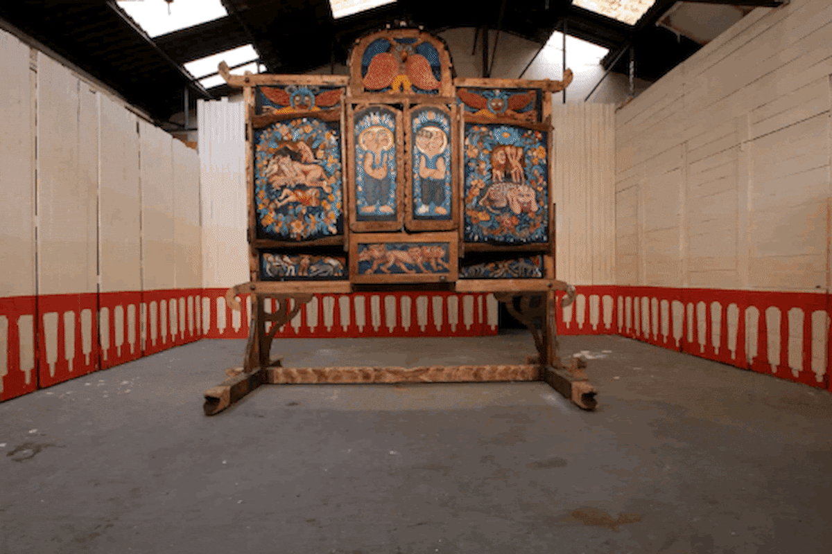 Première résidence de la saison, Cécilien doudoufreaky, dans une ambiance musicale africano-orientale installe depuis une semaine son nouveau retable. Il est composé d’imageries médiévales, fait avec une approche plastique moderne ou la finition de l’objet danse d’un aspect brute à de raffinés détails. Dans la structure ornementée pullule des sujets fantastiques de différentes époques, empruntant aussi bien la queue d’une sirène romane, que des vêtements d’une tapisserie florale, d’une tête du symbole soleil. Bref de multiples scènes capteront ton attention, invitation au voyage imaginaire, bonheur dans tes yeux assuré.